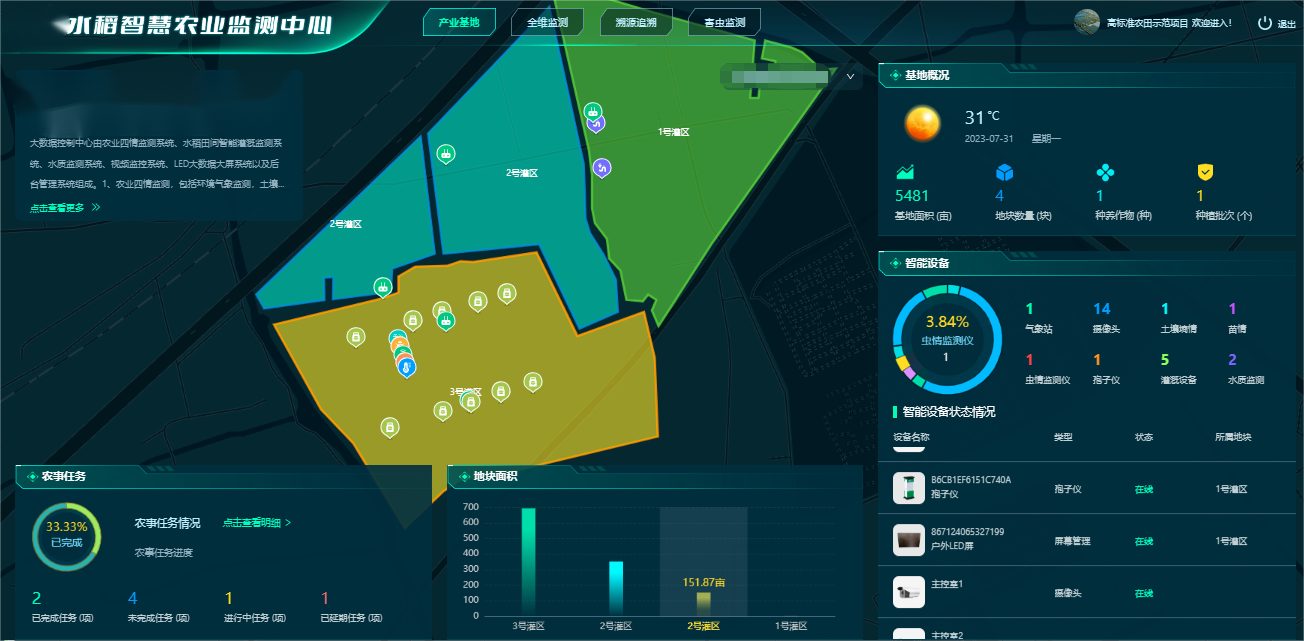 通过GIS二维地图展示基地以及所在区域的地块、农作物、物联网智能设备,可查看地块、农作物详情、物联网设备实时数据、历史数据和实现设备远程操控。