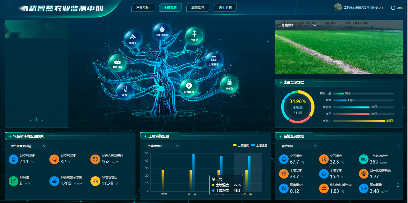以大数据控制中心链接覆盖建设范围内系统设备的精准作业,由农业四情监测系统、水稻田间智能灌溉监测系统、水质监测系统、视频监控系统、LED大数据大屏系统以及后台管理系统组成。