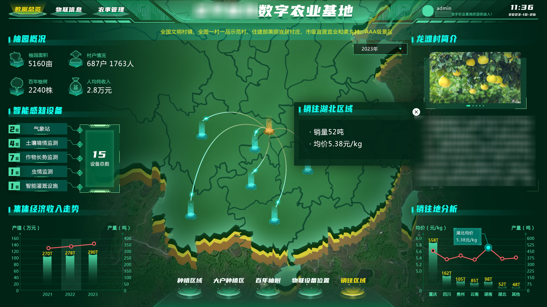 可视化大数据平台:统筹种植区信息、物联设备、农事任务等内容,可视化展示区域内设备状态与控制、产品销售溯源、农事计划与管理等实时数据。