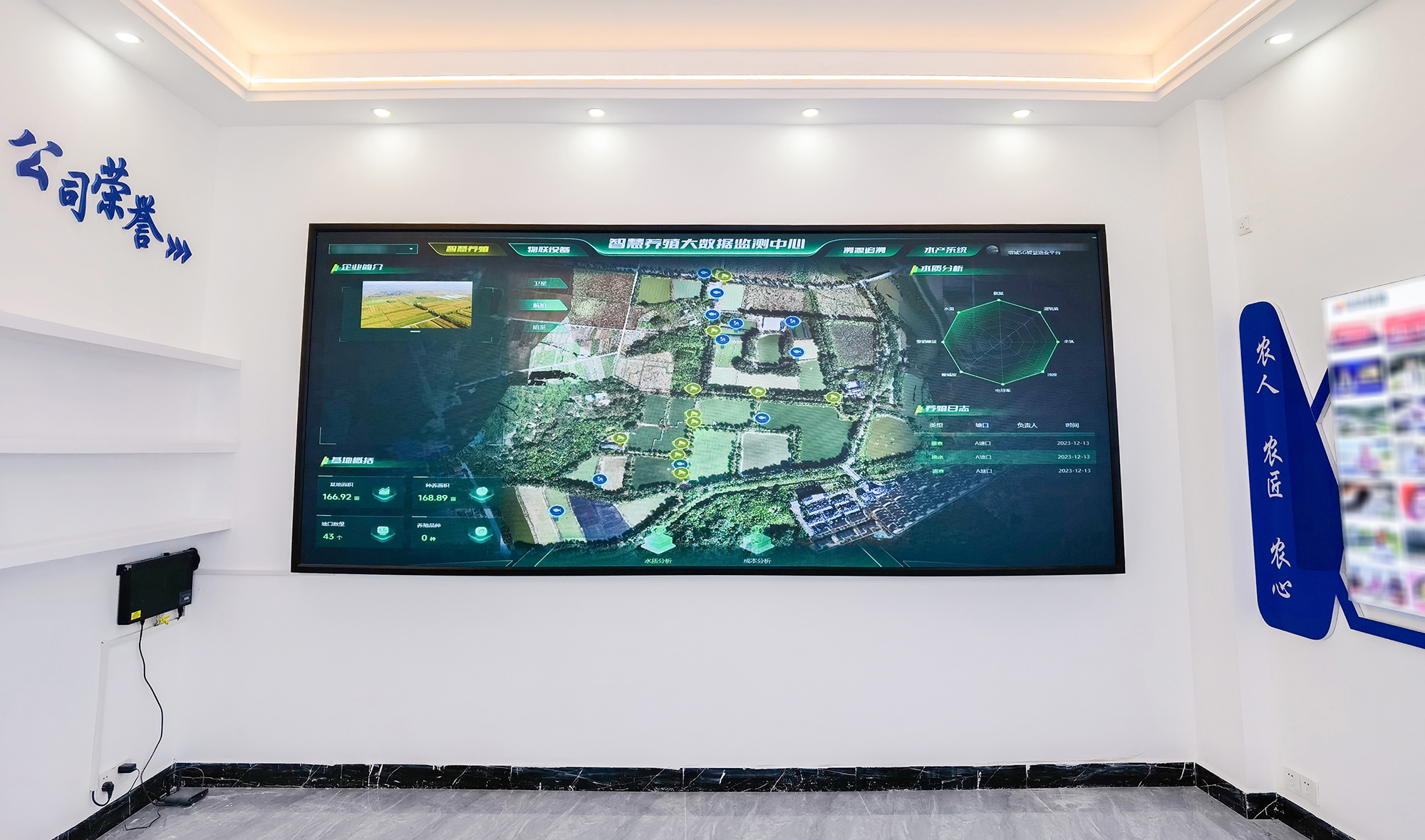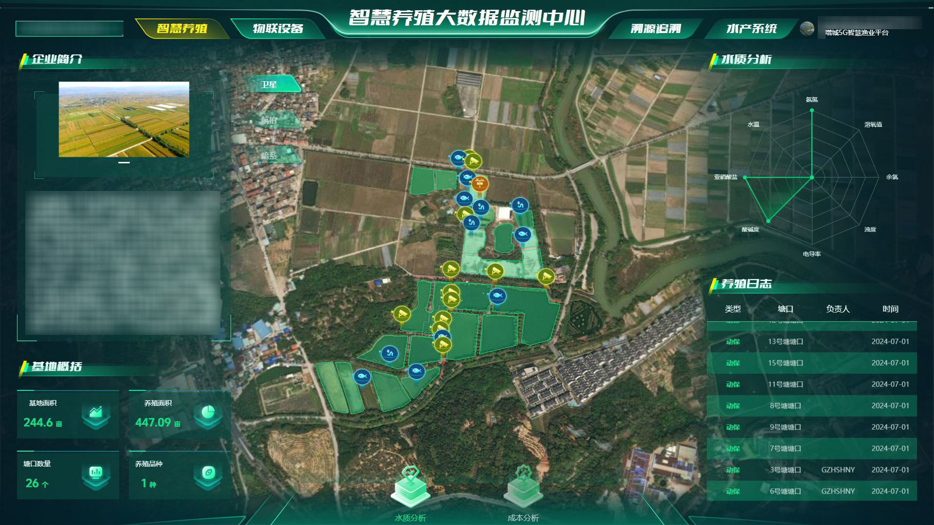 5G智慧渔业平台:部署数字渔场智慧养殖系统、渔场大数据分析系统、溯源系统等软硬件产品,对养殖基地与公司信息、养殖日志、水质分析、物联设备状态、产品销售溯源等大数据进行可视化动态展示。