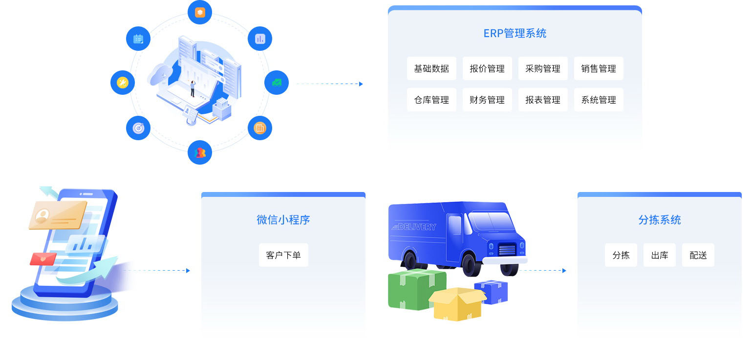 智慧农业生鲜配送erp系统专门为生鲜流通企业而量身打造,提供智能报价、客户下单小程序、智能采购、食安检测、智能分拣、物流配送、财务对账整套解决方案,为生鲜流通企业减少损耗、提高效率保驾护航。