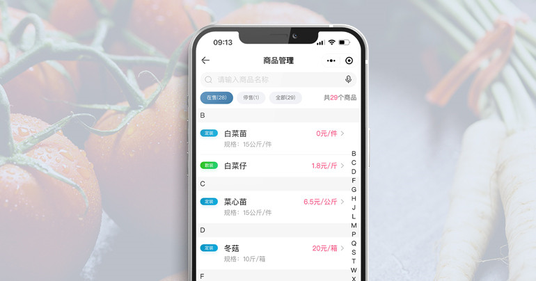 商品管理一键添加商品,支持对包装形式、数量单位、计价方式、规格以及销售单价的详情设置。一键设置商品在售、停售,分类展示。 |