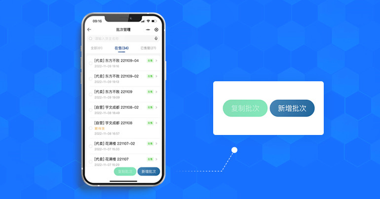 批次管理支持自营及代卖两种批次类型的设置,一键设置售罄状态,货主批次信息同步展示管理。 |