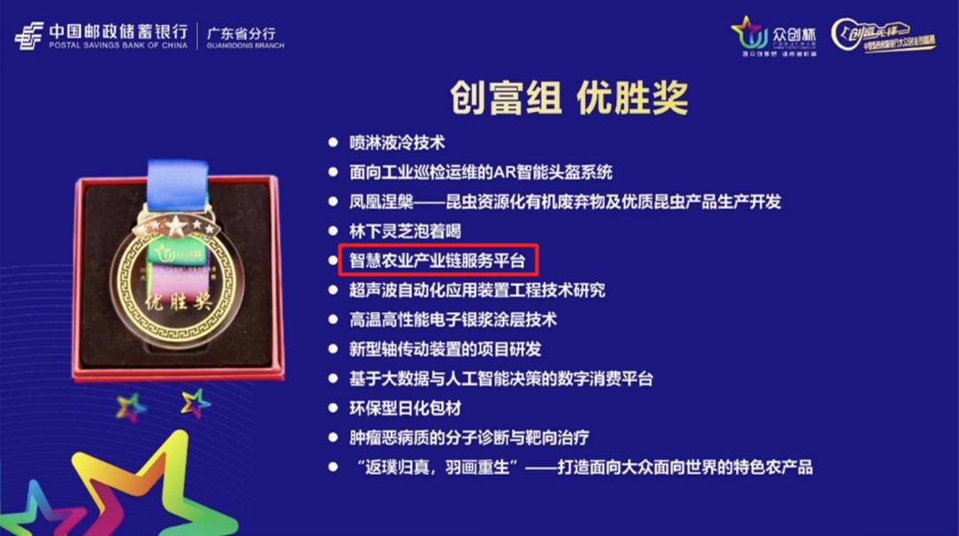 其中,广州市智慧农业服务股份有限公司在本次决赛中跻身创富组前十行列,以“智慧农业产业链服务”主题荣获优胜奖奖项。