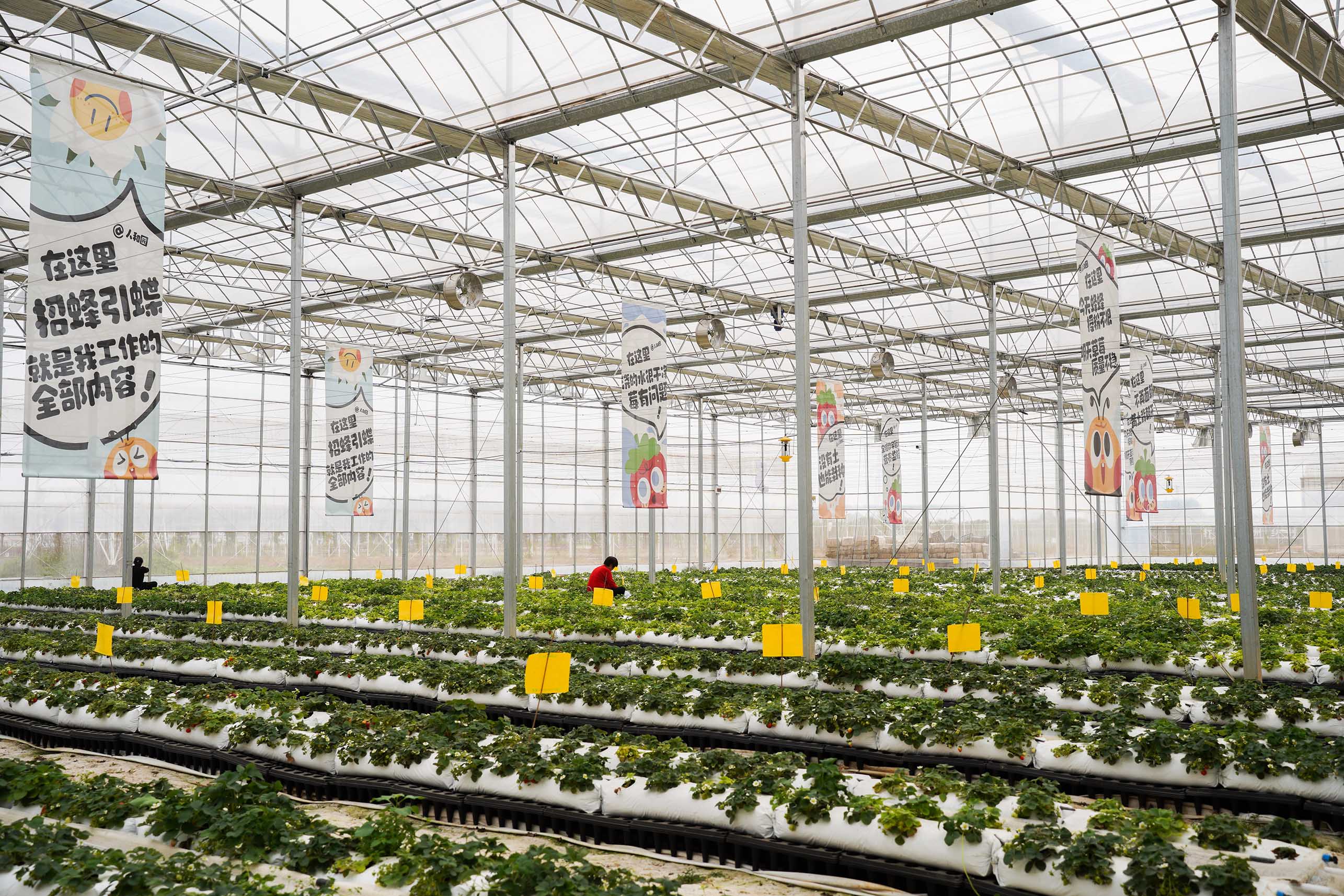 走进我们天空农场这个科技赋能的智慧大棚,草莓清甜飘香而来,一簇簇鲜红粉嫩点缀于万绿丛中。