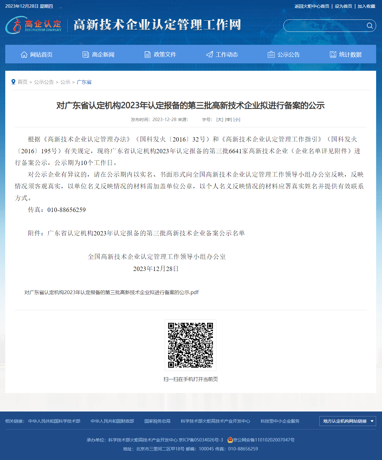 近日,《广东省认定机构2023年认定报备的第三批高新技术企业备案公示名单》公布,