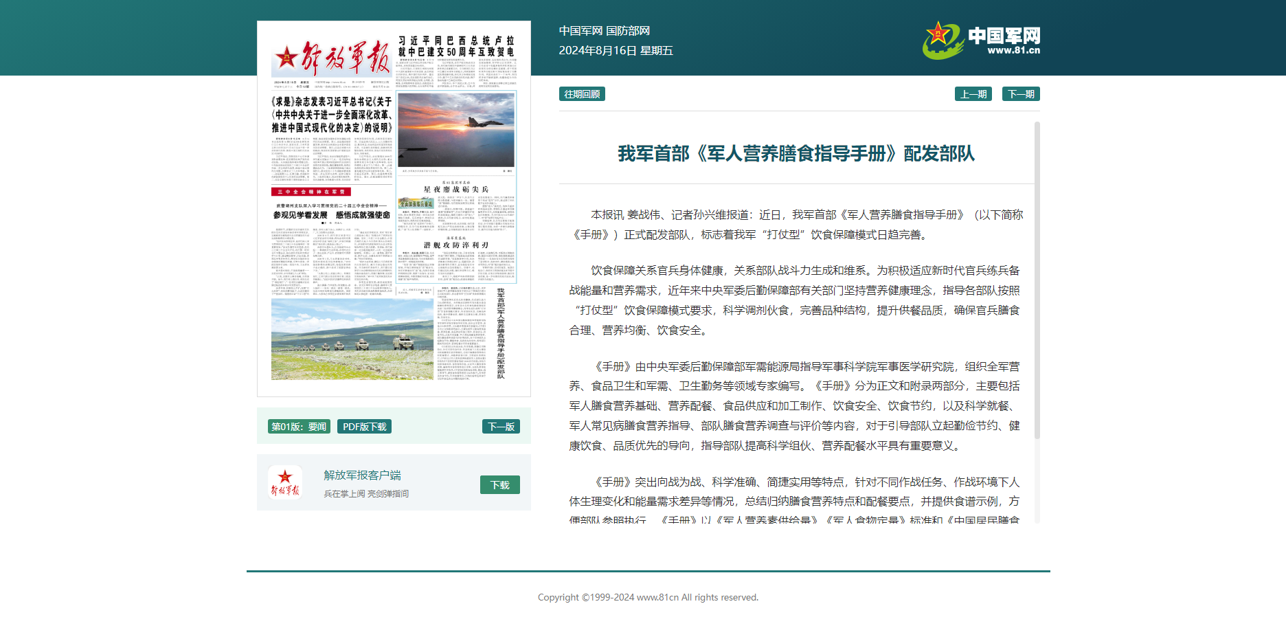 8月份,解放军报在发表的文章中提到:近日,我军首部《军人营养膳食指导手册》(以下简称《手册》)正式配发部队,标志着我军“打仗型”饮食保障模式日趋完善。据报道,《手册》主要包括军人膳食营养基础、营养配餐、食品供应和加工制作、饮食安全、饮食节约,以及科学就餐、军人常见病膳食营养指导、部队膳食营养调查与评价等内容,对于引导部队立起勤俭节约、健康饮食、品质优先的导向,指导部队提高科学组伙、营养配餐水平具有重要意义。