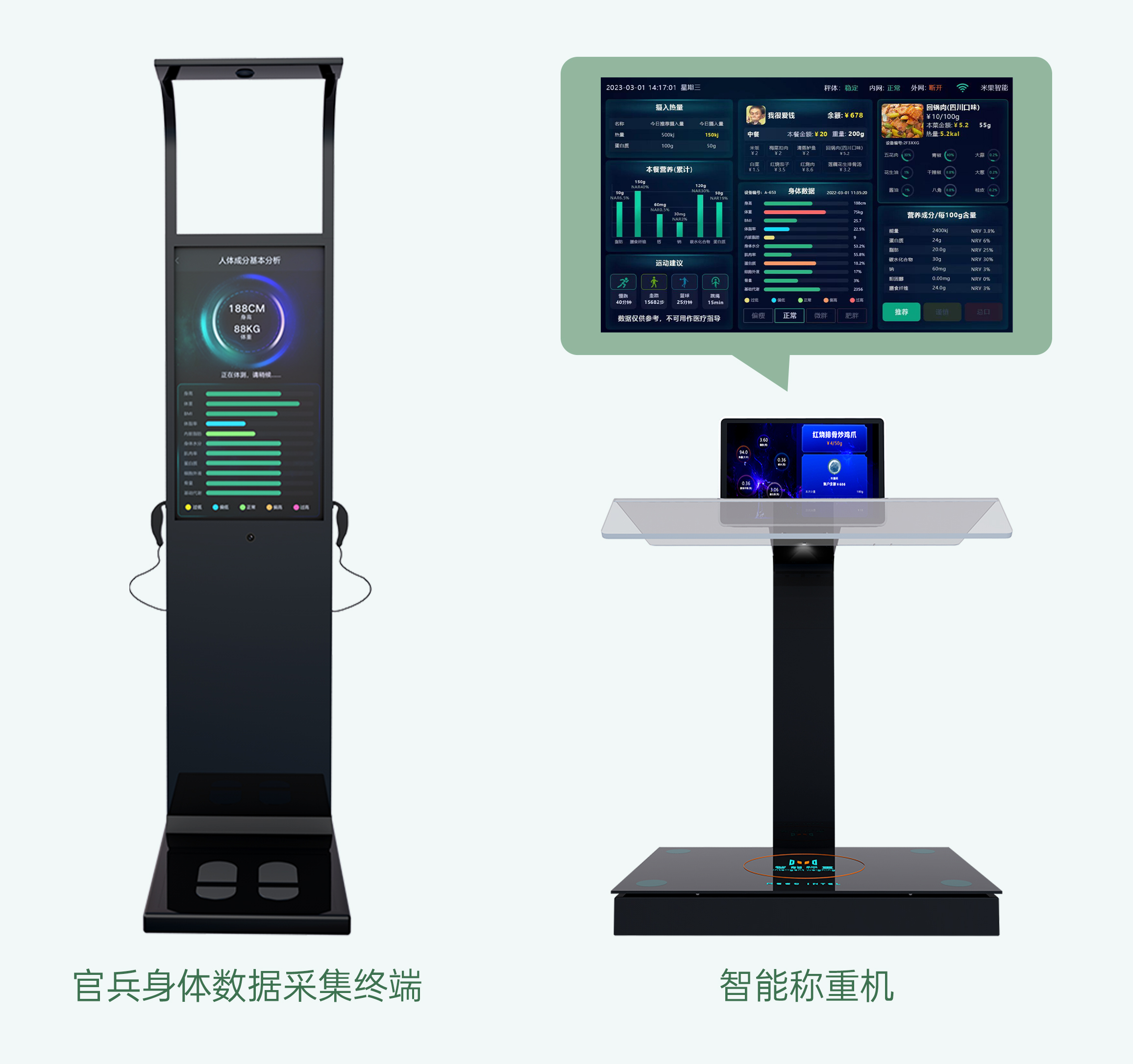 通过官兵身体数据采集终端自动测量身体健康状况,系统可根据官兵的年龄、性别、体重、训练强度、健康状况等信息,提供及时的健康预警和个性化饮食调整建议。结合智能称重机设备获取每餐营养摄入情况,利用AI技术跟踪和评估官兵饮食效果,定期提供营养健康报告,以供医疗人员及战力选拔参考。