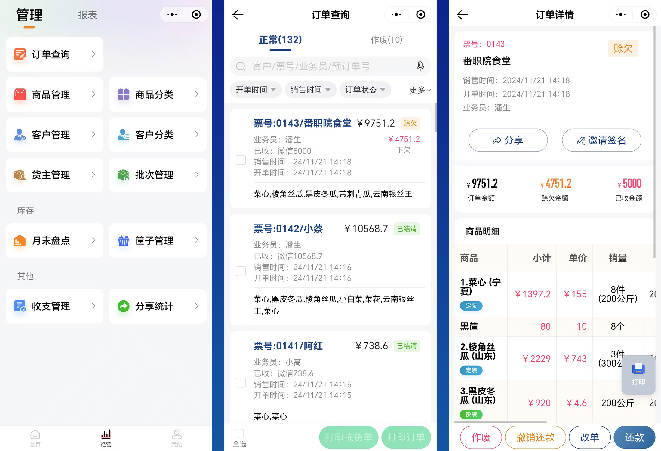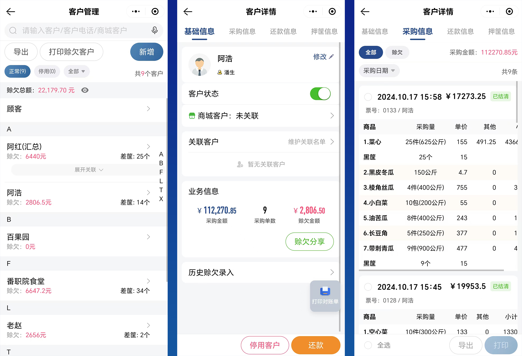 对于客户管理,其基础信息、采购信息及还款信息都能清晰罗列,同时具备客户赊欠提醒功能,档主可一键赊欠分享,邀请客户确认订单。