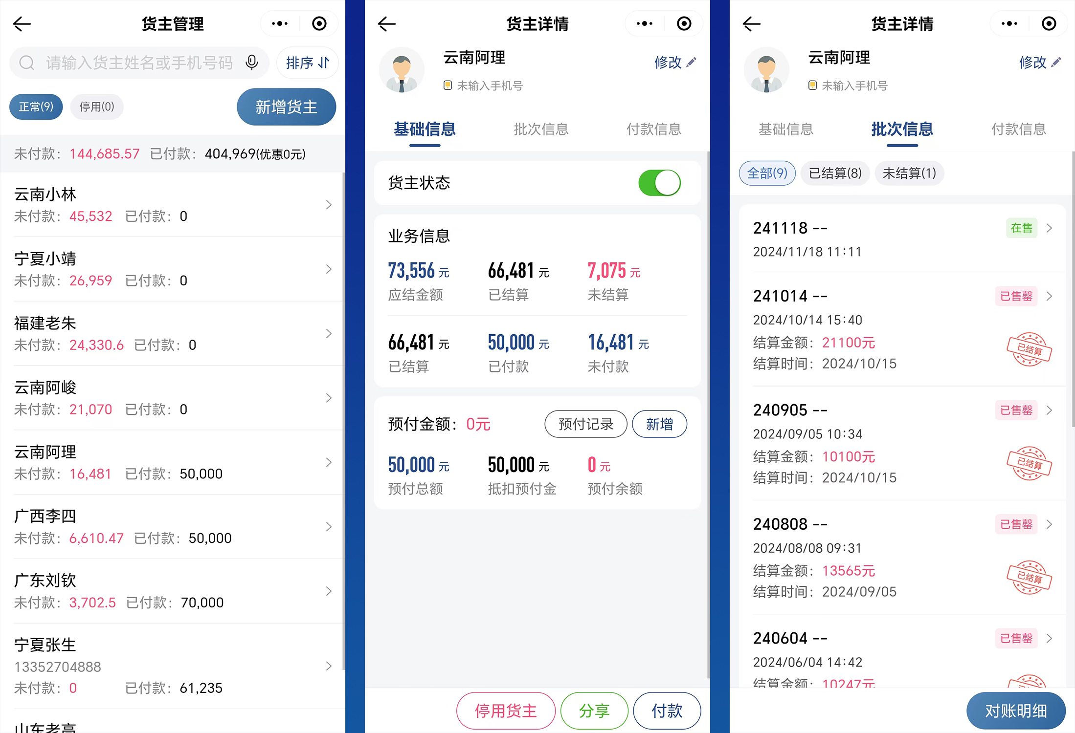 货主的基础信息、批次信息、结算信息等都能清晰展示,支持对商品进行报损管理,库存信息自动更新,还可一键设置货主状态为停用或营业。