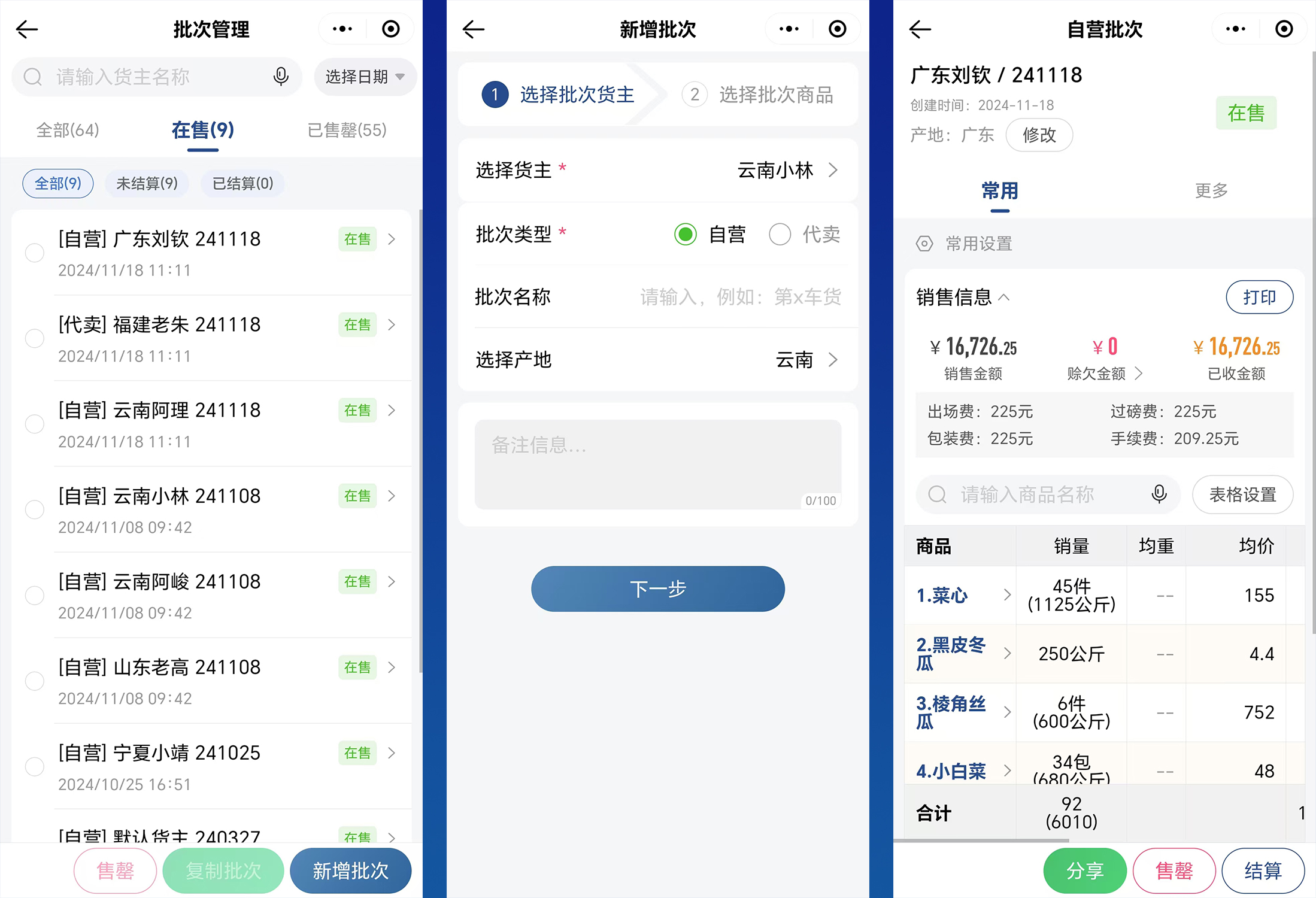 在批次管理方面,支持自营及代卖两种批次类型,可一键设置售罄状态,货主批次信息同步展示,方便档口对不同货主及批次的商品进行有效管理。