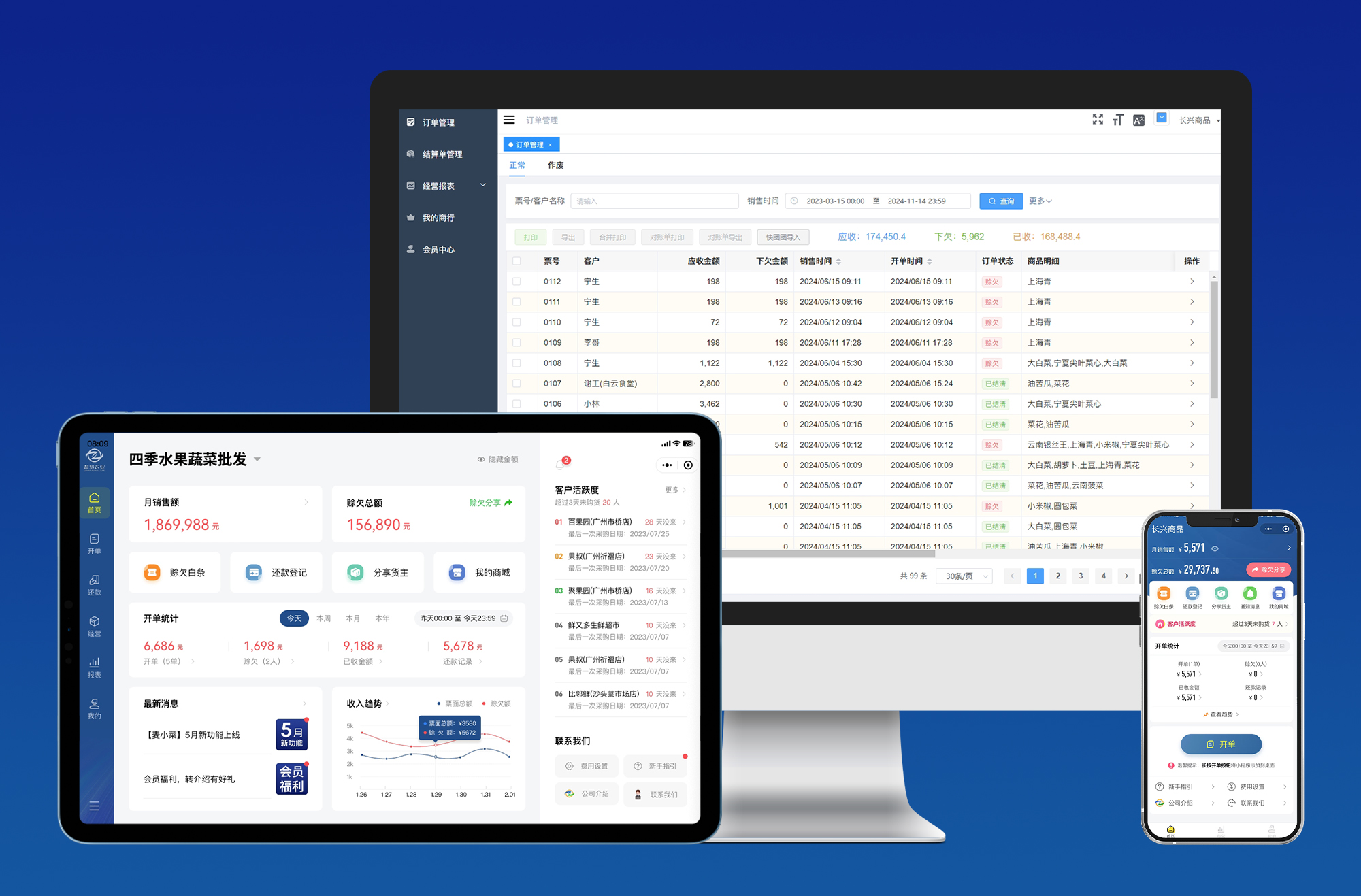 多端同步使用:麦小菜不仅有手机端、平板端,还有电脑端,多端数据同步。用户可以根据自己的使用场景和需求,在不同设备上随时随地使用软件,通过电脑端大屏幕还可以查看管理大量数据报表,方便档口老板进行商行管理和经营盘点。