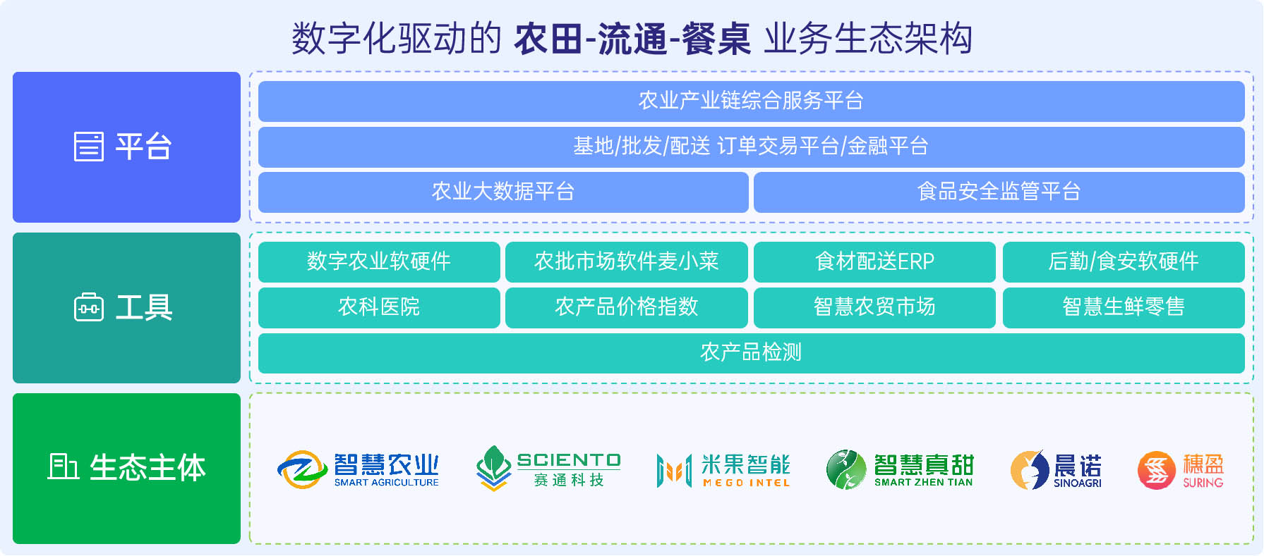 搭建农业生态体系:成功构建了一个连接农业上、中、下游的生态系统,从生产服务到供应链管理,从农资营销到食品安全,初步实现了“用互联网链接农业”的构想。
